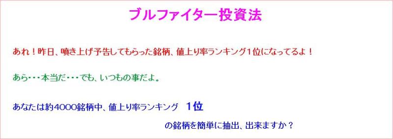 ⇒「明日の暴騰銘柄判定!ブルファイター投資法」の詳細はこちら!